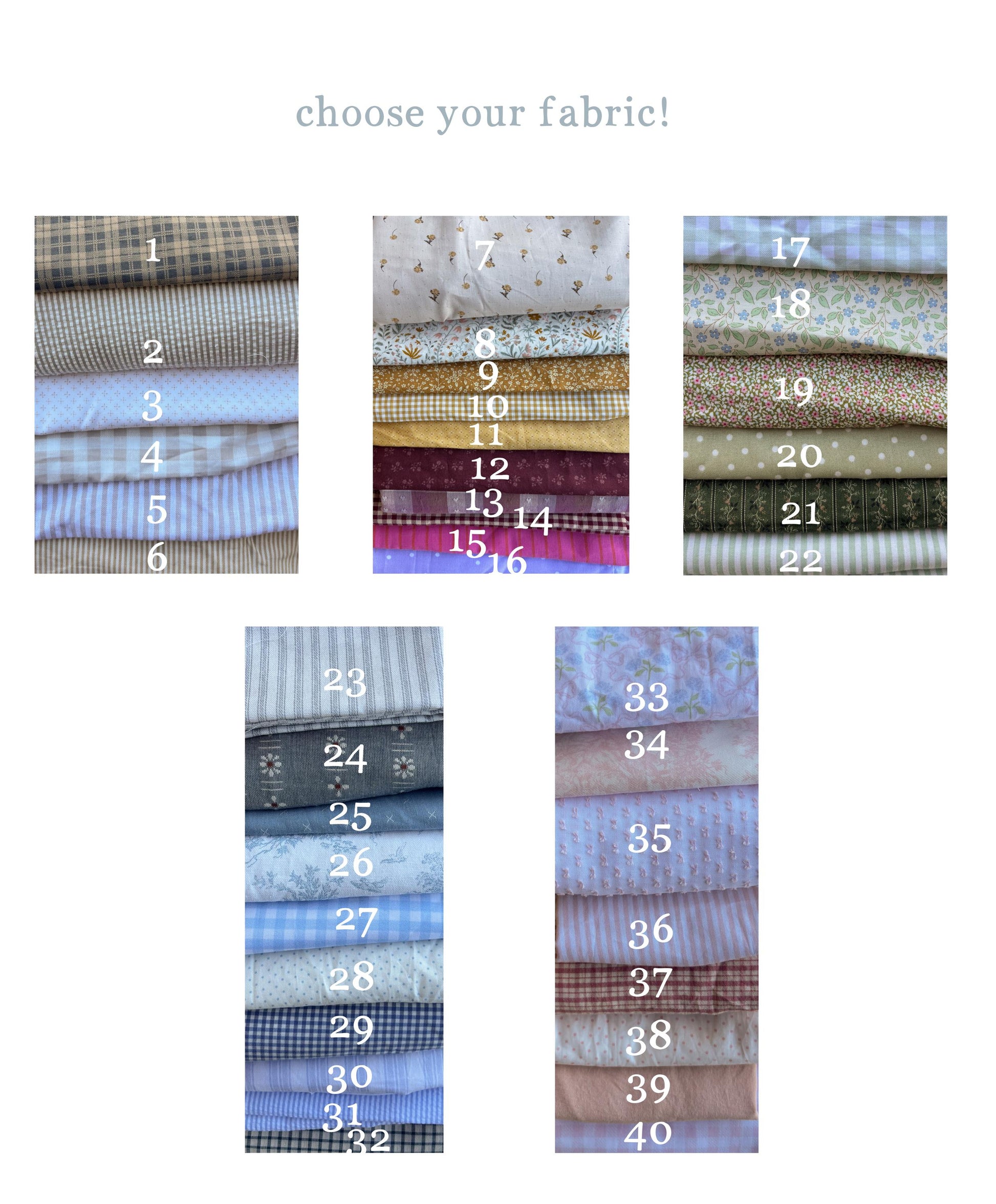 you can use one fabric for all letters or mix and match — not sure what pairs well? just message me!